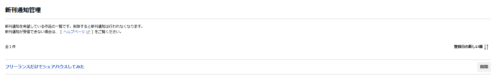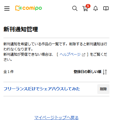 マイページ内の [ 新刊通知管理 ] ページを参照いただくことで、新刊通知を受け取る設定になっている作品の一覧をご確認いただけます。